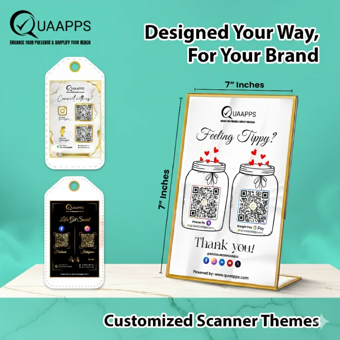 Simplify in-store payments with the QUAAPPS L-Shaped UPI QR Code Scanner Stand, designed to help businesses accept fast, secure, and contactless payments with ease. Featuring a smart L-shaped design, the stand sits perfectly on counters, billing desks, and reception areas for maximum visibility and customer convenience. With tap or scan functionality, customers can instantly make payments using GPay, PhonePe, Paytm, and all UPI-enabled apps—no additional devices or apps required. The quick scan experience reduces checkout time and enhances customer satisfaction at the point of sale. Formulated from premium scratch-resistant acrylic with a luxury, crystal-clear finish, the stand delivers durability while elevating the professional look of your business space. The sturdy build ensures long-term use even in high-traffic environments. Ideal for retail stores, cafes, restaurants, salons, clinics, offices, grocery shops, and service counters, this UPI QR stand offers a clean, modern, and reliable payment solution. A simple yet powerful upgrade that supports seamless transactions and improves everyday business efficiency. Choose QUAAPPS for a smarter, cleaner, and more professional way to accept digital payments
