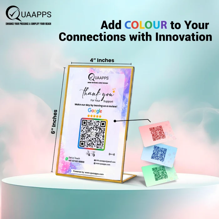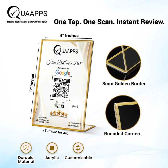 Enhance your online reputation effortlessly with the QUAAPPS Customizable L-Shaped NFC Review Stand for Google Feedback. Designed for modern businesses, this premium countertop stand combines advanced Tap & Scan NFC technology with a vibrant colored QR code, allowing customers to leave Google reviews instantly. A simple tap or scan takes them directly to your feedback page—quick, seamless, and user-friendly. The scratch-resistant, premium acrylic construction ensures durability and long-lasting clarity, making it ideal for busy environments such as restaurants, cafés, salons, hotels, clinics, retail stores, and offices. The L-shaped design improves visibility while keeping your counter organized. Fully customizable with your business logo and branding, the Quaapps NFC review stand not only collects instant feedback but also strengthens brand presence and customer trust. Turn satisfied customers into powerful online reviews with QUAAPPS—smart, durable, and designed for results.