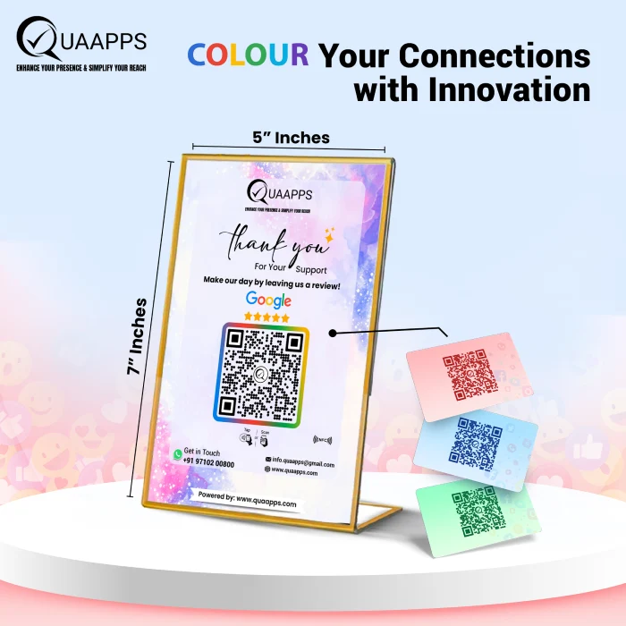 Upgrade your customer experience with the QUAAPPS L-Shaped NFC Google Review Stand, designed to help businesses collect more Google reviews effortlessly. Featuring a premium scratch-resistant acrylic build and a crystal-clear display, this stand adds a luxury, professional look to your counter, desk, or reception area. With tap-to-review NFC technology and advanced coloured dotted QR codes, customers can instantly access your Google review page—no apps required. The L-shaped design ensures stable placement and high visibility, making it perfect for high-footfall business locations. Make your brand stand out with full customization options, including your business logo, name, an1. Effortless Setup & Use: L-shaped design allows quick placement on counters, desks, or reception areas—start collecting Google Reviews instantly. d themed designs. Whether you run a café, salon, restaurant, clinic, consultancy, or office, this smart NFC stand simplifies feedback collection, builds trust, and enhances online credibility. A simple tool that delivers powerful results—more reviews, stronger brand presence, and higher customer engagement.