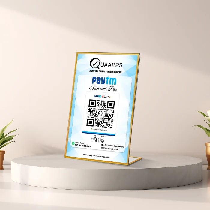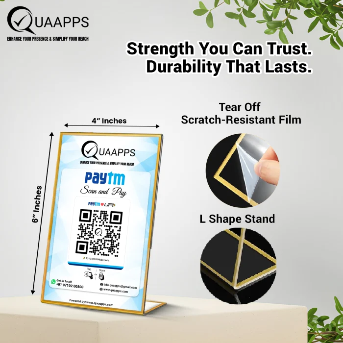 Enhance your online reputation effortlessly with the QUAAPPS Customizable L-Shaped NFC Review Stand for Google Feedback. Designed for modern businesses, this premium countertop stand combines advanced Tap & Scan NFC technology with a vibrant colored QR code, allowing customers to leave Google reviews instantly. A simple tap or scan takes them directly to your feedback page—quick, seamless, and user-friendly. The scratch-resistant, premium acrylic construction ensures durability and long-lasting clarity, making it ideal for busy environments such as restaurants, cafés, salons, hotels, clinics, retail stores, and offices. The L-shaped design improves visibility while keeping your counter organized. Fully customizable with your business logo and branding, the Quaapps NFC review stand not only collects instant feedback but also strengthens brand presence and customer trust. Turn satisfied customers into powerful online reviews with QUAAPPS—smart, durable, and designed for results.